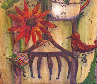 This is my latest folk-art painting inspired by antiques and gardening. On this particular painting I have hung a rusty rake on a moss covered shutter. The rake has been decorated with vintage items and flowers.